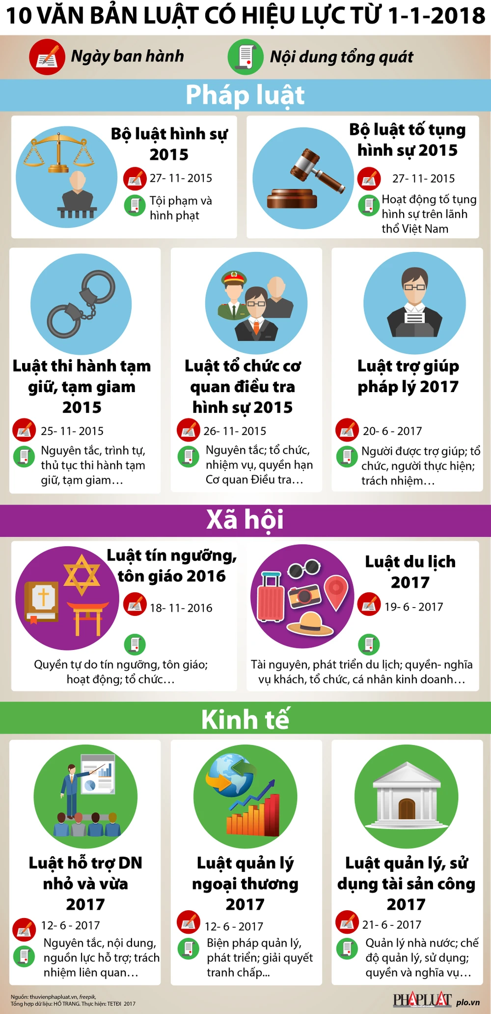 (PLO)- Từ 1-1-2018, 10 văn bản luật thuộc ba mảng pháp luật, kinh tế, xã hội dưới đây sẽ có hiệu lực: