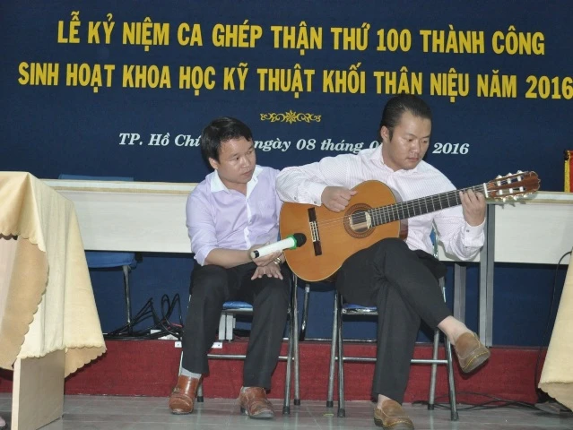 Bệnh nhân Lê Minh Trí đánh đàn cảm ơn các y, bác sĩ và người hiến thận cho mình. Ảnh: TÙNG SƠN
