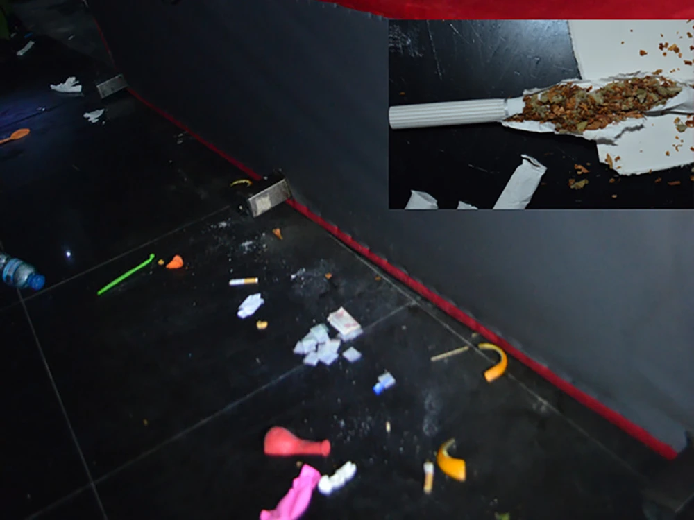 Phát hiện cảnh sát, gần 100 “dân chơi” đang lắc lư theo tiếng nhạc nháo nhào bỏ chạy. Số khác ném những túi nhỏ xuống sàn tìm cách phi tang nhưng tất cả đều bị phát hiện giữ lại.