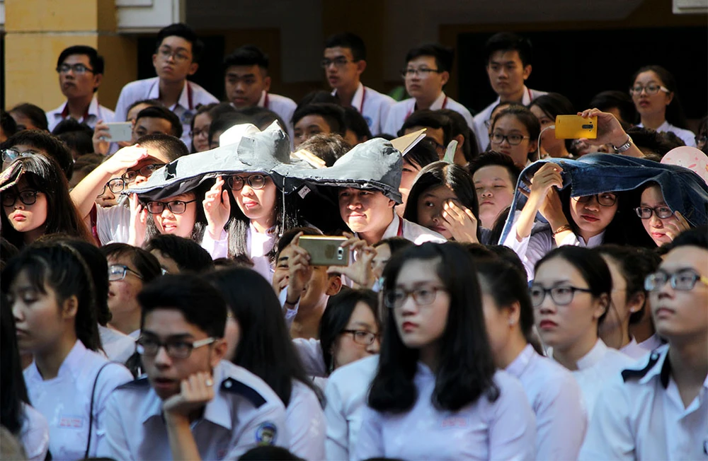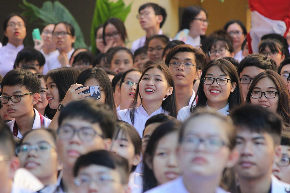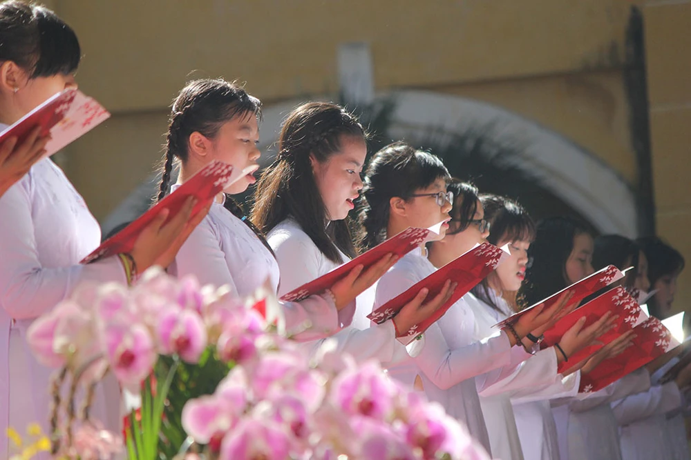 Học sinh chăm chú theo dõi chương trình kỷ niệm ngày truyền thống Trường Trưng Vương.