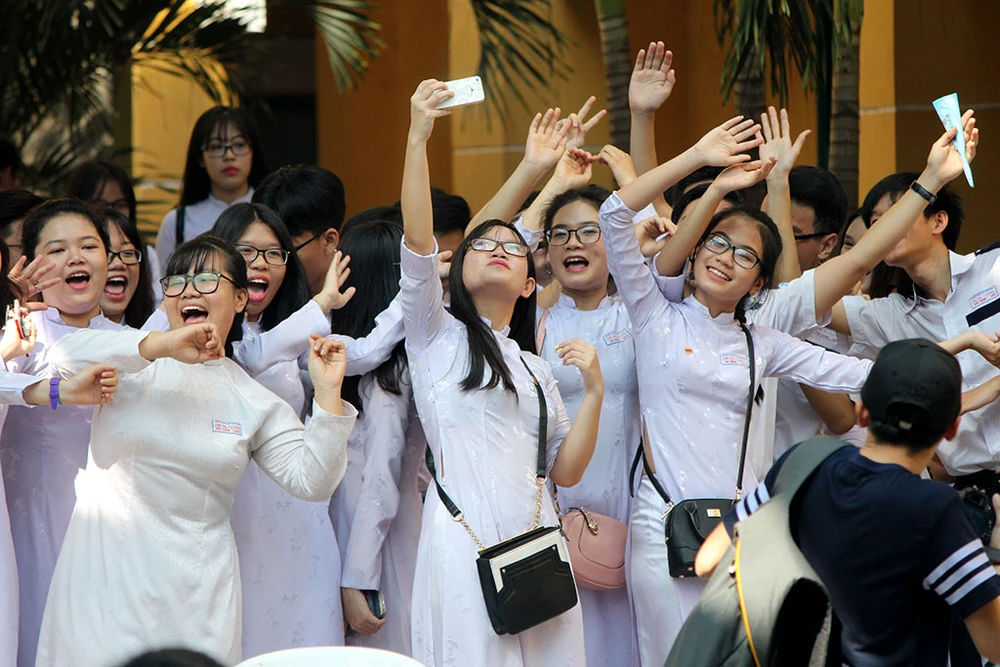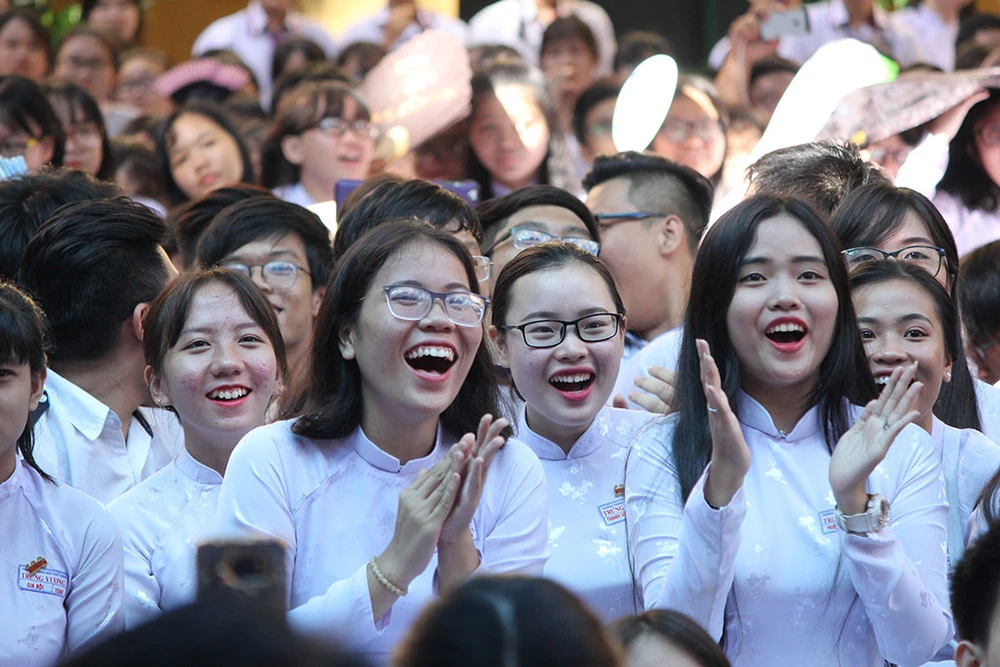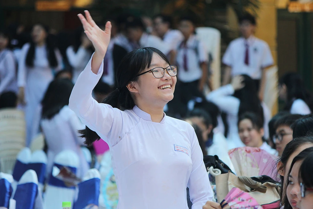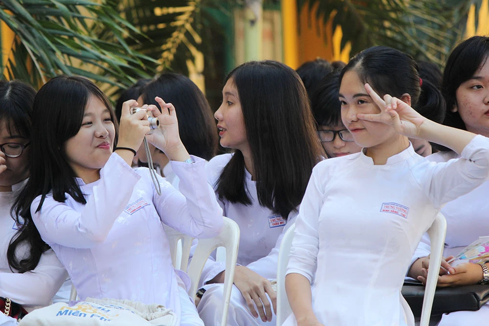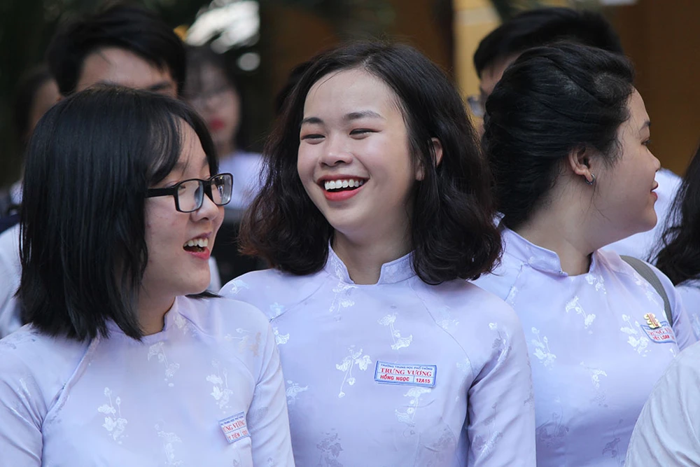 Nụ cười rạng rỡ của các em nữ sinh Trưng Vương trong ngày truyền thống.