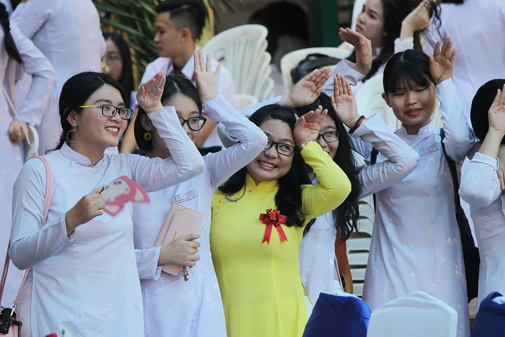 Cô trò cùng tạo dáng chụp ảnh trong ngày truyền thống.