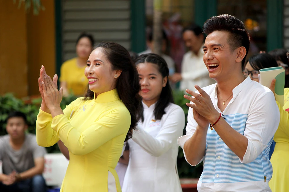 Cô Trương Thị Bích Thủy - Hiệu trường nhà trường và diễn viên Đình Toàn - cựu học sinh Trưng Vương cùng vỗ tay theo các tiết mục biểu diễn trong lễ kỷ niệm.
