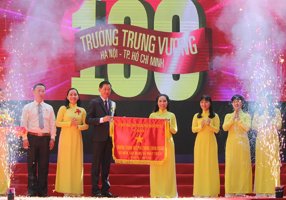 Ông Trần Vĩnh Tuyến - Phó Chủ tịch UBND TP.HCM trao cờ truyền thống cho Trường Trưng Vương.