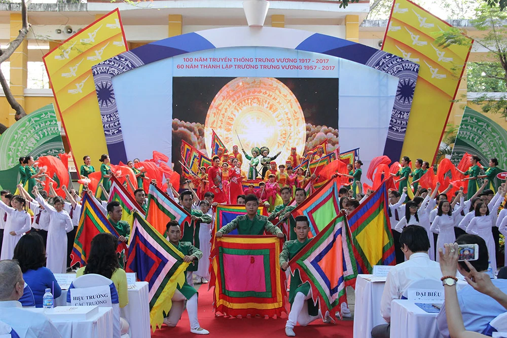 Cô Trương Thị Bích Thủy - Hiệu trưởng nhà trường phát biểu ôn lại truyền thống tốt đẹp, hào hùng của tổ tiên, của Hai Bà Trưng - danh nhân lịch sử mà trường được vinh dự mang tên; các thế hệ giáo viên, học sinh đã tiếp nối và làm rạng danh truyền thống của ngôi trường; những thành tích dạy và học của thầy trò Trường Trưng Vương hiện nay.