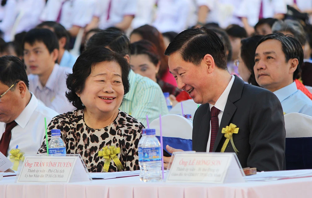 Bà Trương Mỹ Hoa - Nguyên Phó Chủ tịch nước CHXHCN Việt Nam trao đổi với ông Trần Vĩnh Tuyến - Phó Chủ tịch UBND TP.HCM tại buổi lễ.