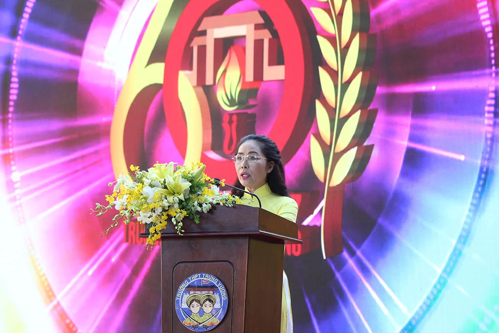 Cô Trương Thị Bích Thủy - Hiệu trưởng THTPT Trưng Vương phát biểu ôn lại truyền thống tốt đẹp của nhà trường.