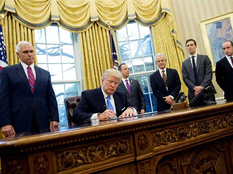Tổng thống Trump ký một sắc lệnh hành pháp tại Phòng Bầu dục, Nhà Trắng vào ngày 23-1. Ảnh: AFP