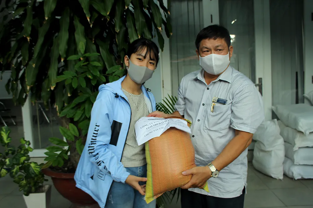 Cô Huỳnh Thị Ngọc Yến (47 tuổi) cùng con gái Nguyễn Huỳnh Thu Ngân (16 tuổi) đội mưa, chạy từ Gò Vấp sang nhận gạo. Cô mừng rỡ: “Kệ, có gạo ăn với nước tương, sống qua ngày là được rồi”. Những ngày chống dịch, quán ăn cô Yến hay phụ đã đóng cửa, bữa giờ mấy mẹ con có gì ăn nấy, chỉ mong hết dịch để đi làm lại, kiếm cái ăn, lo cho con đi học. Cô Yến bảo, cách đây 14 năm, cô sinh mổ trong một bệnh viện nhưng vì không có tiền để thanh toán, cô liều mạng ôm con trốn đi.