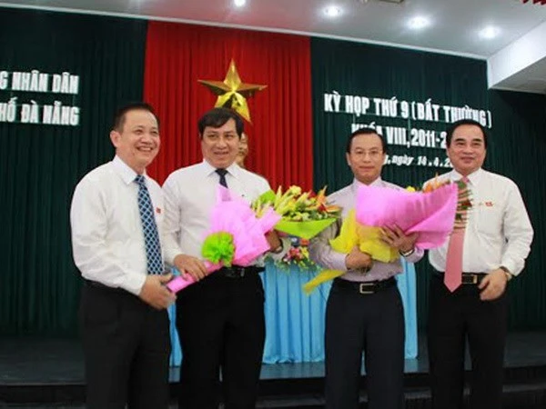 Lãnh đạo Đà Nẵng tặng hoa cho Phó Bí thư Nguyễn Xuân Anh (thứ hai, bên phải qua) và tân Phó Chủ tịch Ủy ban Nhân dân thành phố Huỳnh Đức Thơ (thứ hai, bên phải qua). (Nguồn: danang.gov.vn)