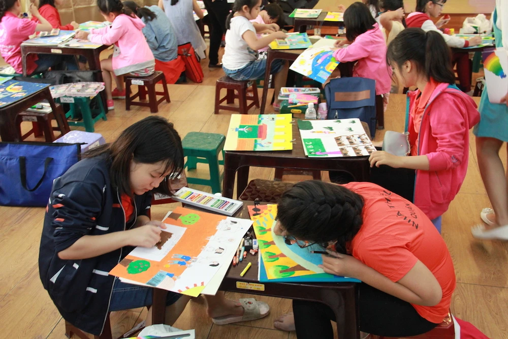 Các học sinh đến từ các Nhà thiếu nhi quận, huyện trong TP.HCM tham gia vẽ tranh với về Quyền trẻ em