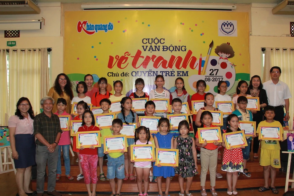 30 bạn có bức tranh đẹp nhất sự kiện nhận bằng khen và chụp ảnh cùng với thành viên Hội bảo vệ quyền trẻ em TP.HCM và báo Khăn Quàng Đỏ.