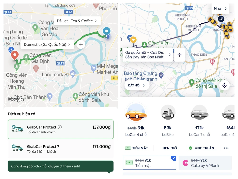 Anh Hải cho biết thử đặt xe ở hai hãng khác nhau, quãng đường từ phường Bình Thọ (TP Thủ Đức) tới sân bay Tân Sơn Nhất (quận Tân Bình) khoảng cách 13 km thì giá cước không có sự chênh lệch. Cả hai hãng Be và Grab đều đưa ra giá cước hơn 140.000 đồng.
