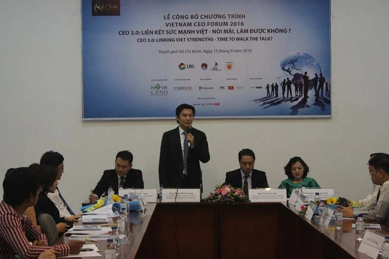 Ông Nguyễn Thu Phong, Chủ tịch Hội Doanh nhân trẻ TP.HCM, chia sẻ lý do về chủ đề Việt Nam CEO Forum “Liên kết sức mạnh Việt - Nói mãi, làm được không?” tại buổi họp báo diễn ra ngày 15-9.