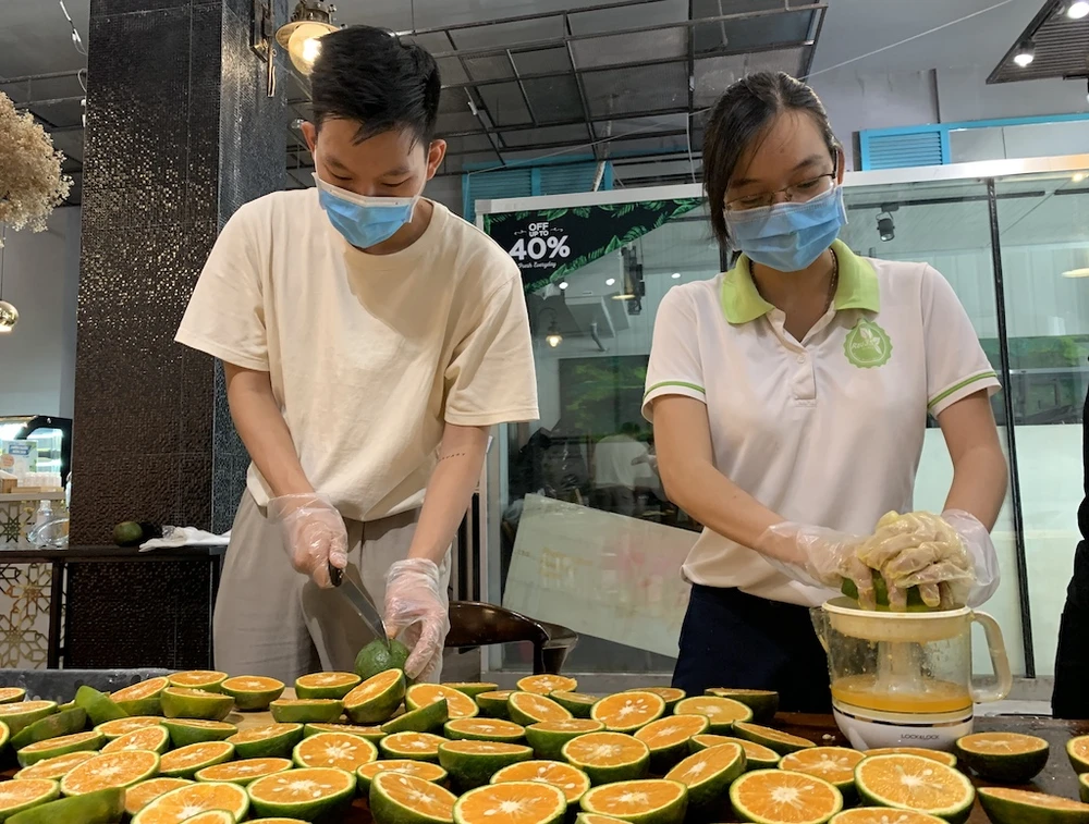 Để giữ được hàng trăm chai nước cam tươi được nguyên chất, không đắng sau khi vắt, vận chuyển đến tay các y, bác sĩ vào đầu giờ chiều thì từ sáng nhóm các bạn trẻ đã phải vắt hàng trăm ký cam.