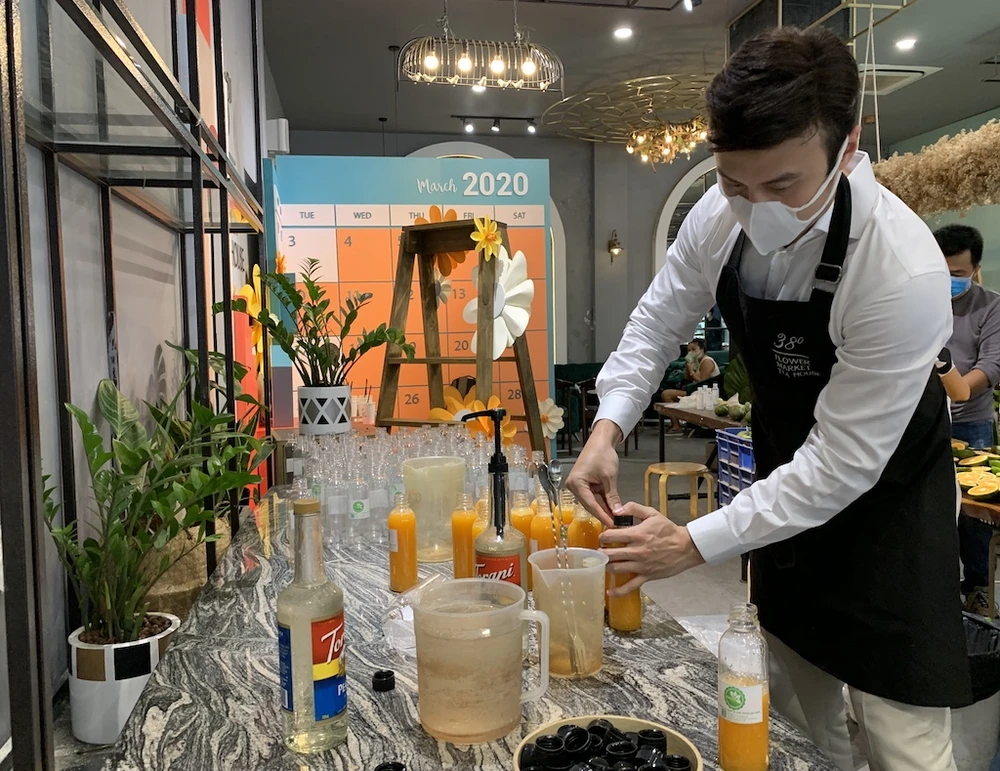 Doanh nhân Lê Đăng Khoa đóng chai nước cam gửi đến đội ngũ y bác sĩ tuyến đầu chống dịch COVID-19 ở TP.HCM. Ảnh: QT