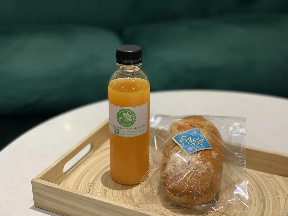 Mỗi phần gồm một chai nước cam nguyên chất và một phần bánh với thông điệp “Tiếp sức tuyến đầu chống dịch COVID-19”.