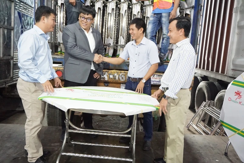 Ông Nayot Rojanasopondist (mặc vest) cùng lãnh đạo Công ty Qui Phúc kiểm tra chất lượng hàng hóa trước khi đóng container.