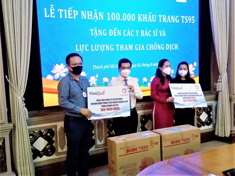 Ngày 2-8, tại UBND TP.HCM, hai doanh nghiệp là Công ty Cổ phần Pacific Foods và Công ty VinaFirst đã trao tặng 100.000 khẩu trang TS 95 kháng khuẩn đến y bác sỹ và lực lượng tham gia chống dịch COVID-19 trước sự chứng kiến của bà Nguyễn Thị Lệ, Phó Bí thư Thành ủy, Chủ tịch Hội đồng Nhân dân TP.HCM và cơ quan chức năng.