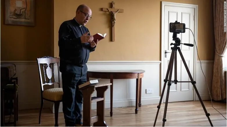 Linh mục Andrew Nunn của nhà thờ Southwark, London (Anh) đang cầu nguyện và phát trực tiếp qua mạng xã hội hôm 10-4. Ảnh: CNN