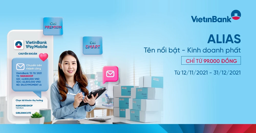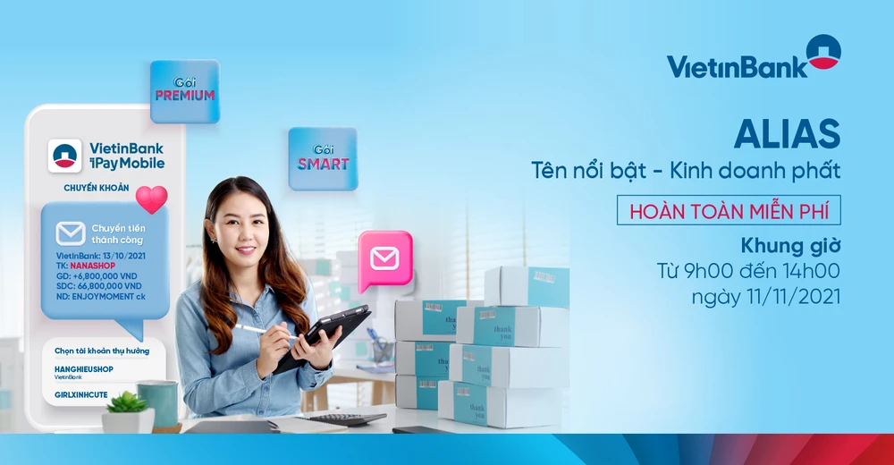 Với mong muốn đồng hành cùng các chủ cửa hàng, hộ kinh doanh gia tăng nhận diện thương hiệu thông qua Dịch vụ đặt biệt danh (Alias) cho tài khoản, từ ngày 11-11, VietinBank tung ra những ưu đãi cực hấp dẫn dành riêng cho các chủ hộ kinh doanh khi sử dụng Dịch vụ đặt Alias. Chỉ từ 0 đồng, các chủ shop đã có thể sở hữu ngay cho mình một Alias bằng chính tên thương hiệu của mình để thực hiện các giao dịch trong và ngoài hệ thống VietinBank vô cùng dễ dàng và tiện lợi.