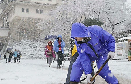 Dọn tuyết gần lâu đài Nagoya tại TP Nagoya. Ảnh: KYODO