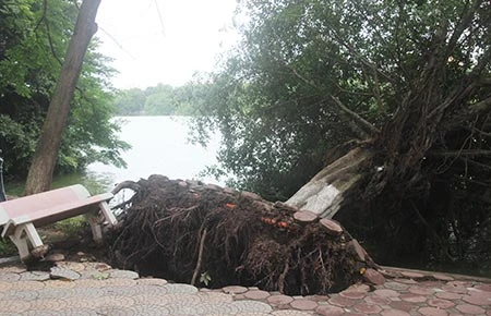 Mưa to khiến cây si trăm tuổi bên bờ Hồ Gươm bật gốc. Ảnh: V.THỊNH