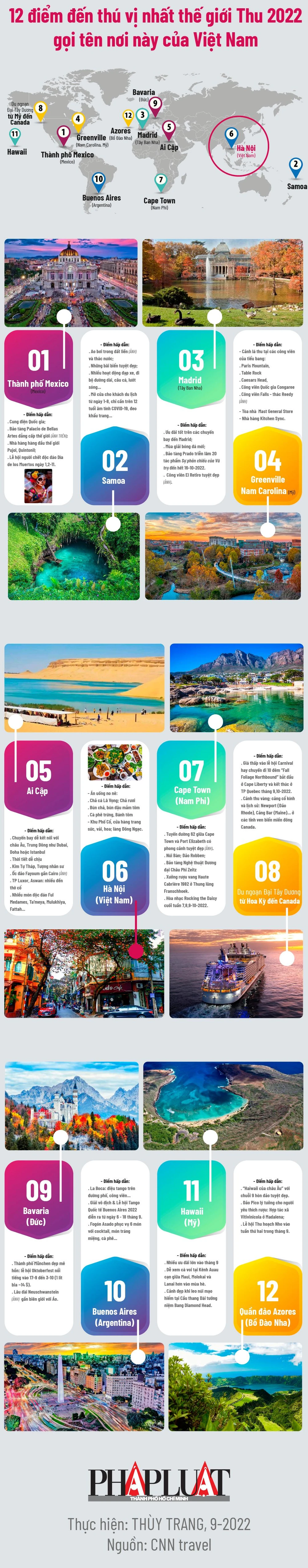 (PLO)- Đây là danh sách đầy đủ 12 điểm du lịch cuối năm 2022 thú vị nhất thế giới được CNN bình chọn, trong đó có một nơi của Việt Nam. Nếu bạn đang muốn lên kế hoạch cho một kỳ nghỉ mùa thu tuyệt vời, ít đông đúc, ít tốn kém hơn, thời tiết ít khắc nghiệt hơn, thì những điểm đến này là những gợi ý lý tưởng không nên bỏ qua.