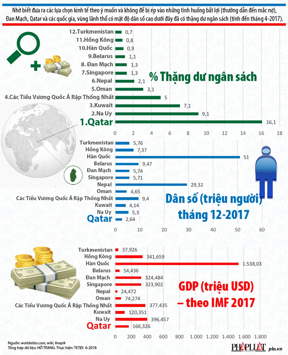 (PLO)- Nhờ biết đưa ra các lựa chọn kinh tế theo ý muốn và không để bị ép vào những tình huống bất lợi (thường dẫn đến mắc nợ), Đan Mạch, Qatar và các quốc gia, vùng lãnh thổ có mật độ dân số cao dưới đây đã có thặng dư ngân sách (tính đến tháng 4-2017).