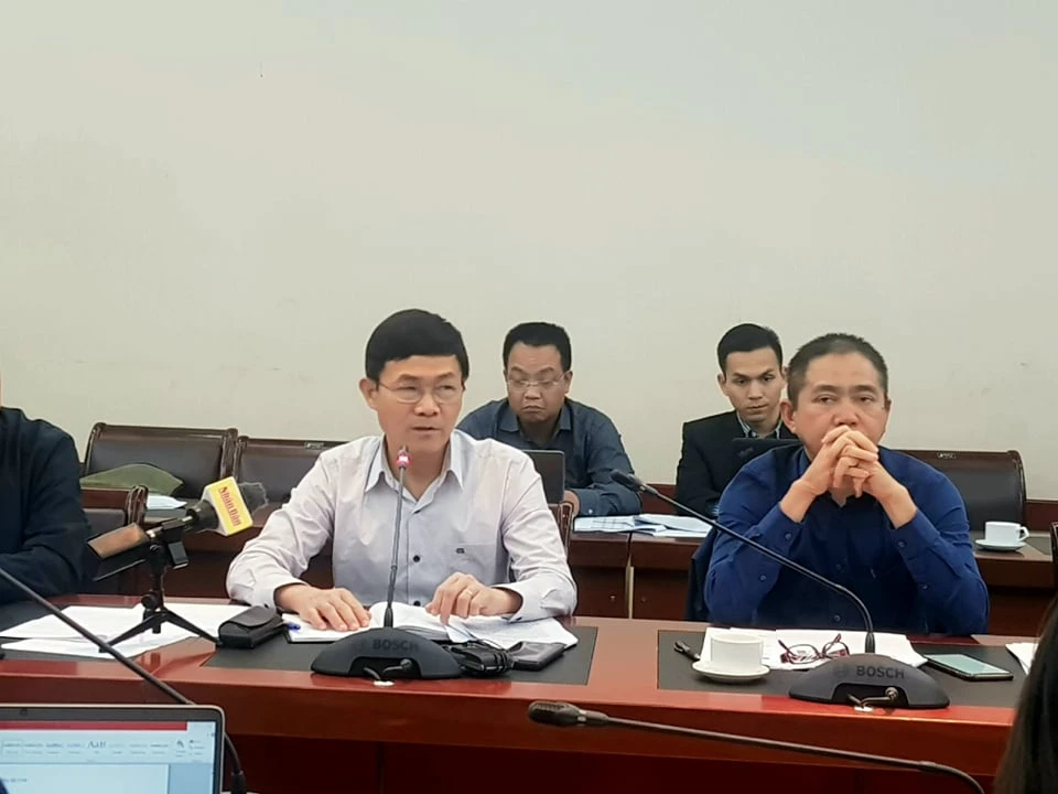 Tổng Cục trưởng Tổng cục Thủy lợi Nguyễn Văn Tỉnh (áo trắng) chủ trì cuộc họp cung cấp thông tin về tình hình nguồn nước phục vụ sản xuất nông nghiệp và dân sinh mùa khô năm 2019-2020. Ảnh: AH