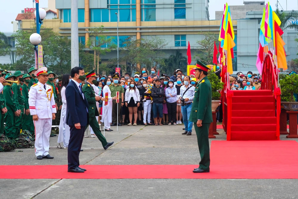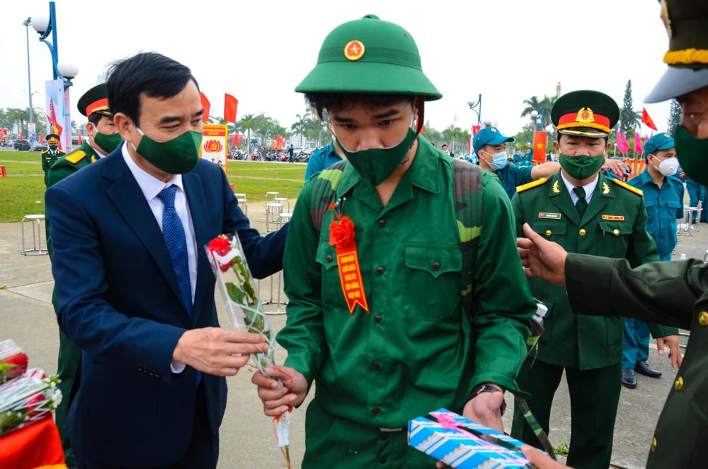 Chủ tịch UBND TP Đà Nẵng Lê Trung Chinh tặng hoa, động viên các tân binh trước khi nhập ngũ.