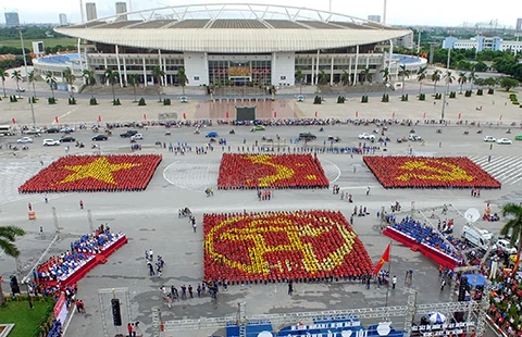 Trong chương trình, các đoàn viên, thanh niên đã tham gia xếp hình khối Bản đồ Việt Nam - cờ Tổ quốc - cờ Đảng - biểu tượng Hà Nội với sự tham dự của 12.000 đoàn viên, thanh niên thủ đô (ảnh).