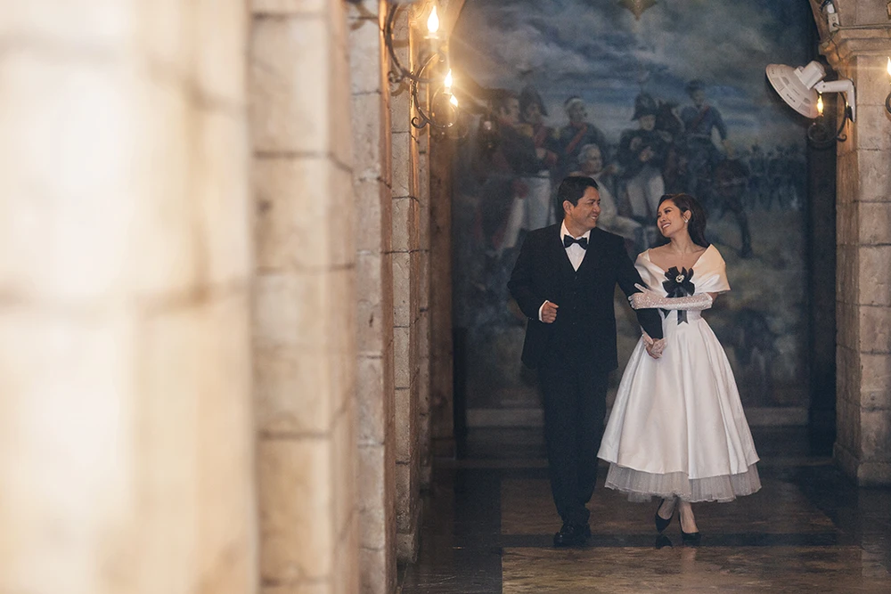 Thanh Thúy mặc một chiếc đầm xòe trắng, Đức Thịnh mặc bộ vest đen lịch lãm. Ảnh: HÀ THỤC