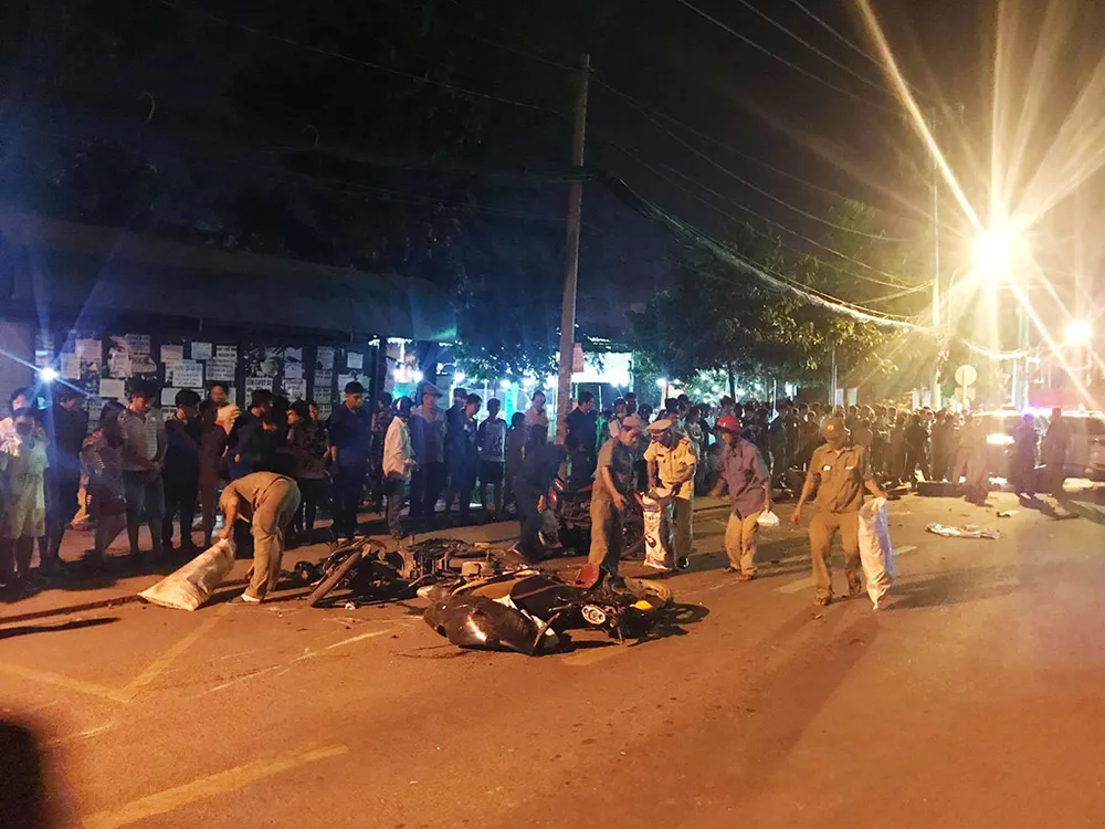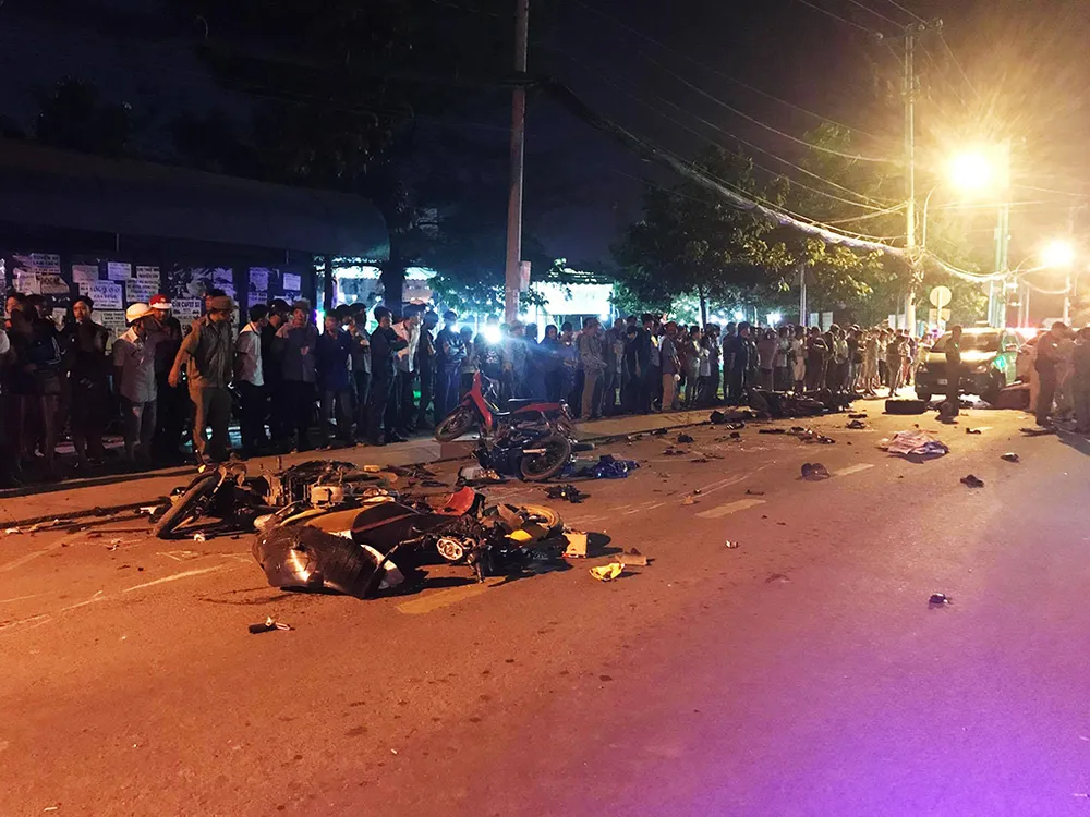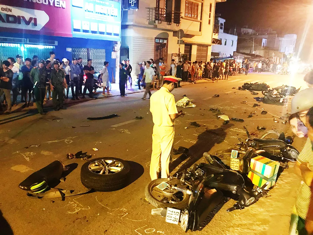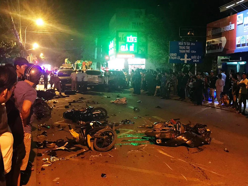 Tại hiện trường, nhiều xe máy nằm rải rác cùng nhiều mảnh vỡ; 3 xe ô tô dính vào nhau. Vụ việc khiến một thiếu niên 15 tuổi tử vong. Ít nhất 10 người bị thương được đưa đi bệnh viện cấp cứu.
