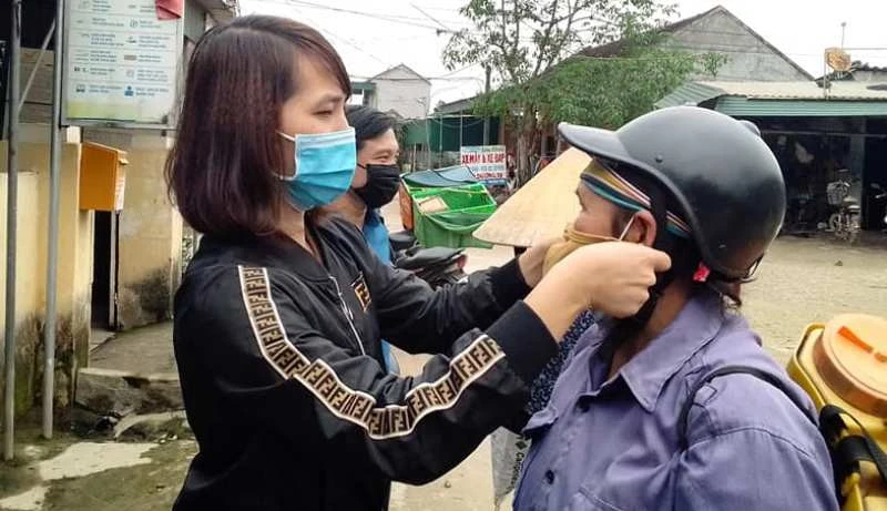 Người dân xã Thanh Yên (huyện Thanh Chương, Nghệ An) được phát khẩu trang miễn phí và hướng dẫn đeo khẩu trang đúng cách.