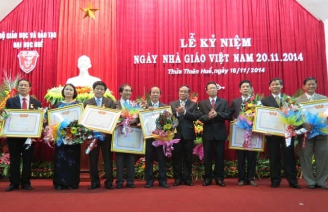 Dịp này, ĐH Huế đã công bố Quyết định của Chủ tịch Nước phong tặng danh hiệu Nhà giáo Nhân dân cho GS.TS Cao Ngọc Thành, Hiệu trưởng trường ĐH Y Dược Huế và PGS.TS Trần Văn Minh, Trường ĐH Nông Lâm Huế và 12 Nhà giáo Ưu tú.