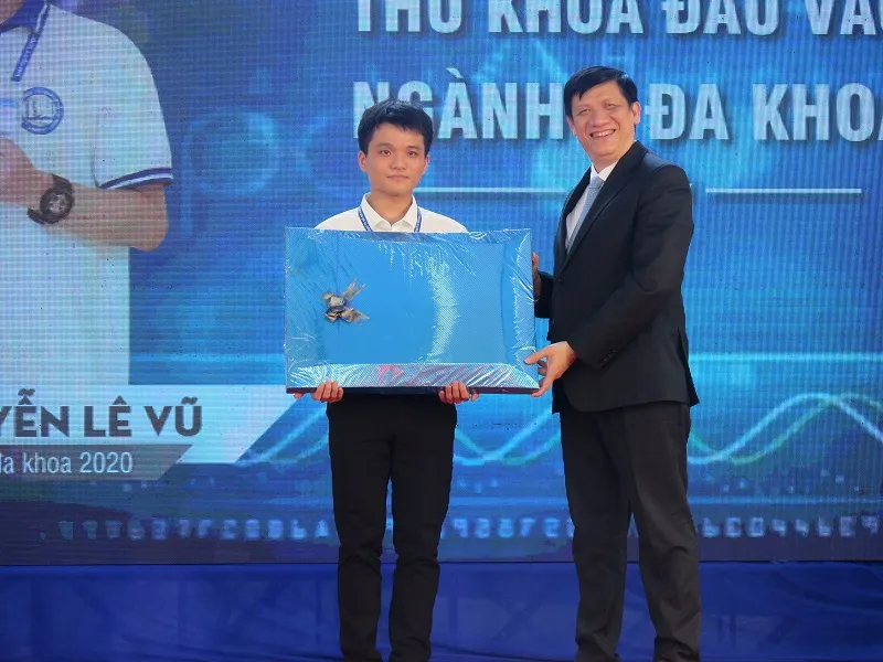 Quyền Bộ trưởng Bộ y tế Nguyễn Thanh Long trao tặng máy tính cho thủ khoa Nguyễn Lê Vũ