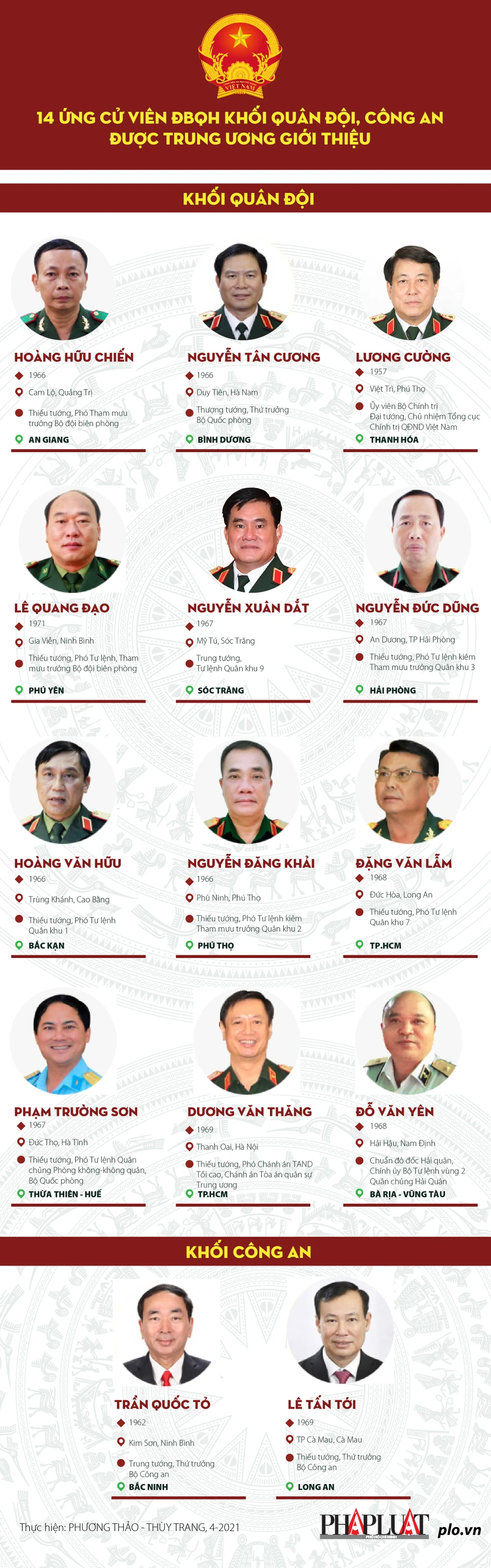 (PLO)- Trong 203 người ở Trung ương được phân bổ về các địa phương ứng cử đại biểu Quốc hội có 12 người thuộc cơ quan Bộ Quốc phòng, các quân khu, quân chủng và lĩnh vực trọng yếu và hai Thứ trưởng Bộ Công an.