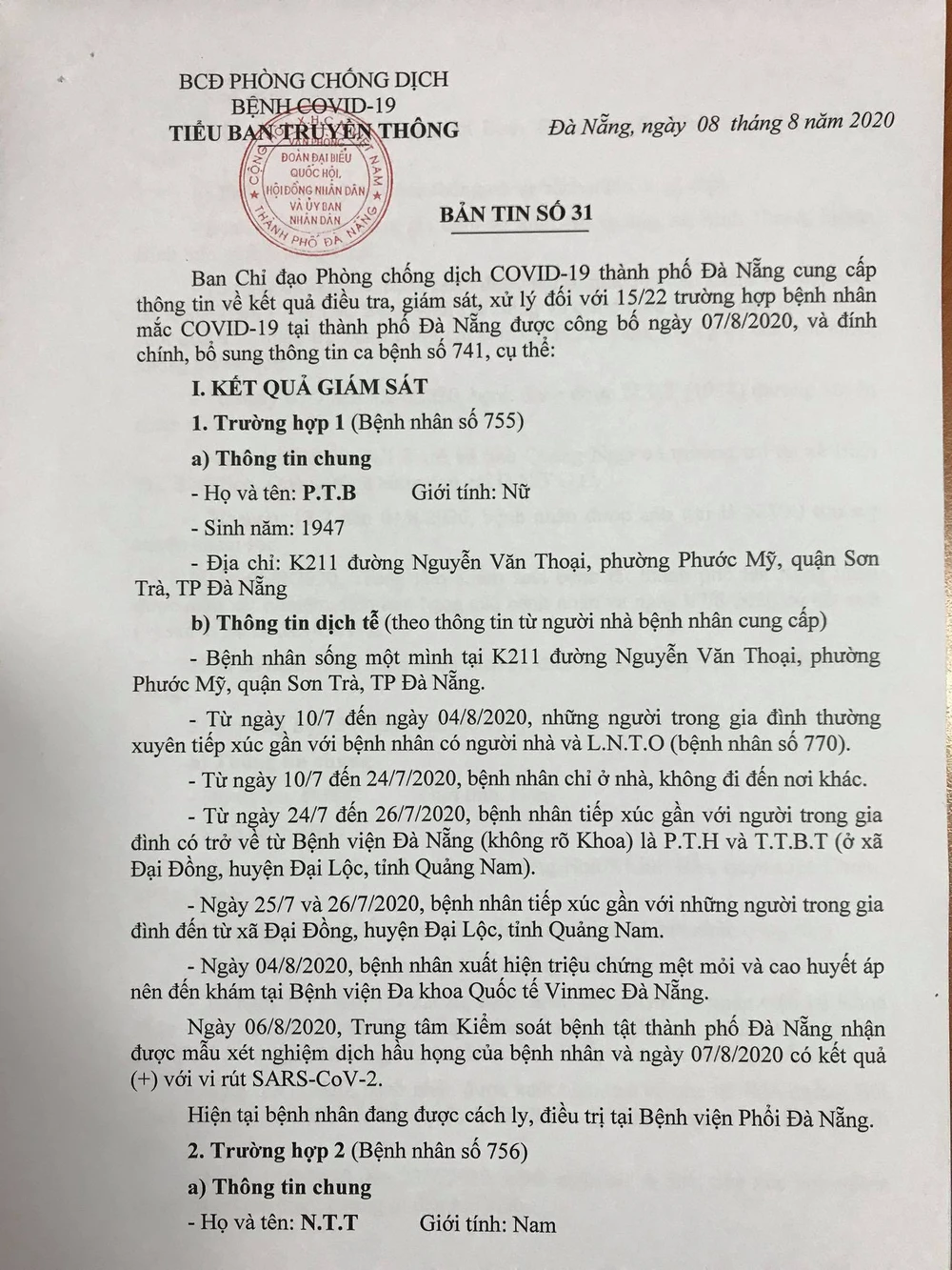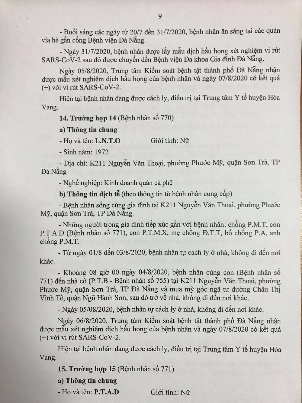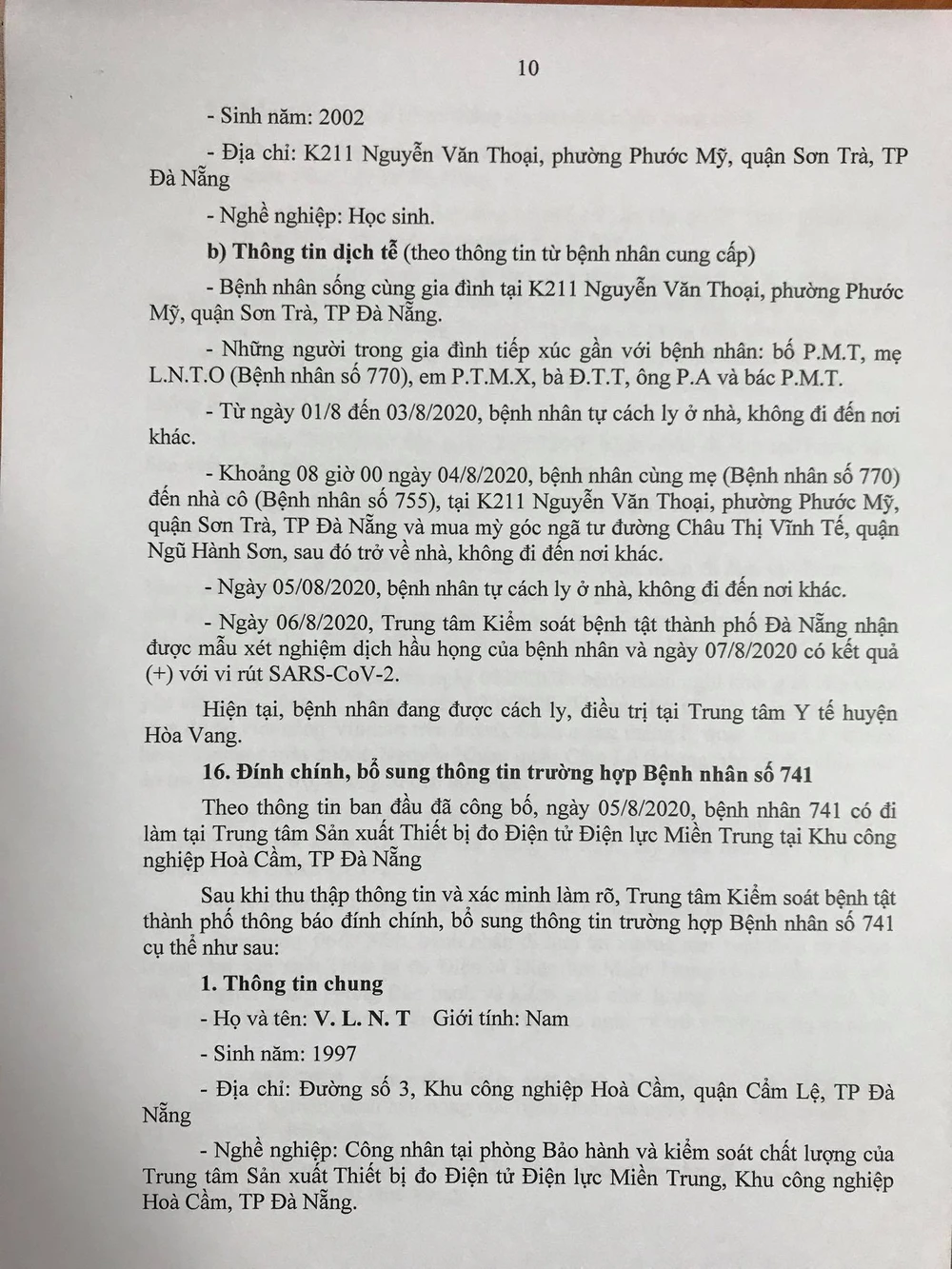 Chiều 8-8, Ban chỉ đạo Phòng chống dịch COVID-19 TP Đà Nẵng cung cấp thông tin về kết quả điều tra, giám sát, xử lý đối với 15/22 trường hợp bệnh nhân mắc COVID-19 tại TP được công bố ngày 7-8, và đính chính, bổ sung thông tin ca bệnh số 741.