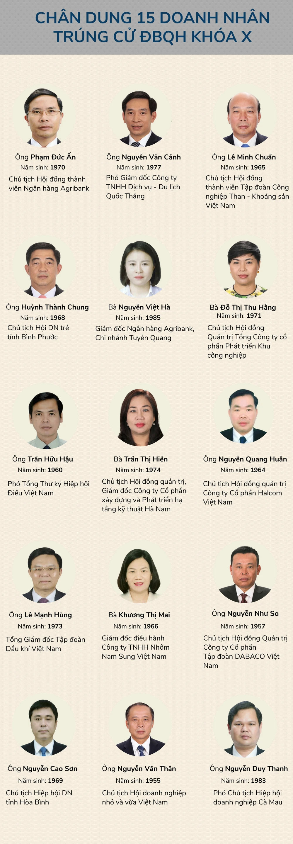 Theo danh sách 499 người trúng cử đại biểu Quốc hội khóa XV do Hội đồng bầu cử Quốc gia công bố chiều 10-6, có 15 doanh nhân, đại diện cho các doanh nghiệp khu vực Nhà nước, tư nhân và hiệp hội doanh nghiệp.