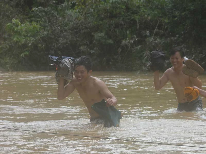 Dù phải băng gần 10 km đường rừng và phải vượt qua đoạn sông cuộn chảy đỏ ngầu nhưng các thầy vẫn giữ tinh thần lạc quan khi nghĩ về học sinh của mình. Ảnh: Đ.TRUNG