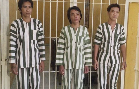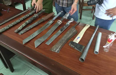 Ba nghi can Võ, Nhã, Minh đang bị tạm giữ để điều tra cùng hung khí công an thu giữ tại hiện trường. Ảnh: TK