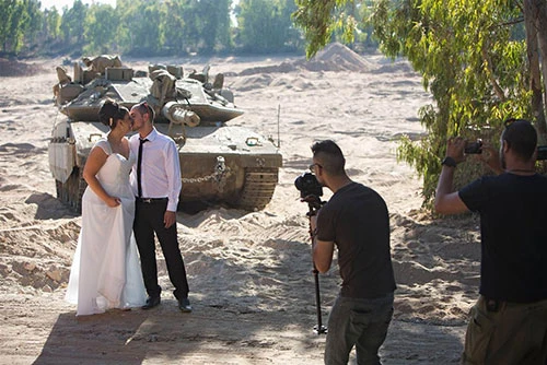 Một cặp vợ chồng người Israel chụp ảnh đám cưới của họ trong một khu vực của quân đội ở biên giới Gaza và Israel, gần Kibbutz Yad Mordechai, Israel, hôm 28-8. Noga và Moshiko Siho, thực hiện bộ ảnh cưới trong khi một thỏa thuận ngừng bắn giữa Israel và các đảng phái Palestine bắt đầu từ tối thứ Ba 27-8. (Ảnh: AP)