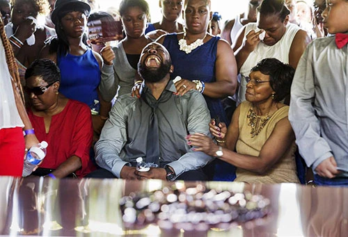 Micheal Brown Senior gào khóc trước quan tài con trai, Micheal Brown Jr trước khi anh được an tán ở nghĩa trang thánh Pierre ở St. Louis, bang Missouri ngày 25-8. Các chính trị gia và nhà hoạt động nhân quyền tụ tập lại và đưa tiễn Micheal tại đám tang sau hơn một tuần bạo động, hậu quả là một số người bị thương và bị bắt giữ (Ảnh: The New York Times)