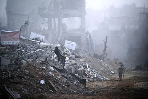Một cư dân cao tuổi của khu phố Shejaiya Thành phố Gaza bước vào một con đường với 2 bên là nhà bị phá hủy vào ngày 27-8. Thành phố này là một trong những ảnh hưởng nặng nhất bởi cuộc chiến giữa Hamas và Israel. (Ảnh AFP)