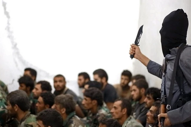 Một chiến binh IS đứng bên cạnh những người lính quân đội Syria bị bắt sau trận chiến ở căn cứ không quân Tabqa thành phố Raqqa, bức ảnh được đăng tải trên mạng bởi Raqqa Media Center hôm 27.8. 150 người lính Syria bị giết ngay sau đó (Ảnh: AP)
