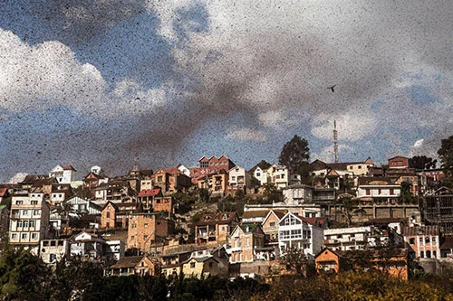 Một đàn châu chấu bay qua trung tâm của thành phố Antananarivo thủ đô của Madagascar ngày Thứ năm,28-8. Một bệnh dịch châu chấu bắt đầu từ hơn hai năm trước, đe dọa an ninh lương thực và mùa màng của 13 triệu cư dân thuộc hòn đảo Ấn Độ Dương này. (Ảnh: AFP)