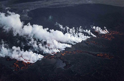 Magma chảy dọc theo một khe nứt dài nửa dặm trong hệ thống núi lửa Bardarbunga Iceland. Iceland nâng mức độ cảnh báo báo động đến mức tối đa vào thứ Sáu 29-8 sau một vụ phun trào nhỏ nhưng cho biết tro núi lửa có thể không ảnh hưởng đến du lịch hàng không ở châu Âu. (Ảnh Reuters)
