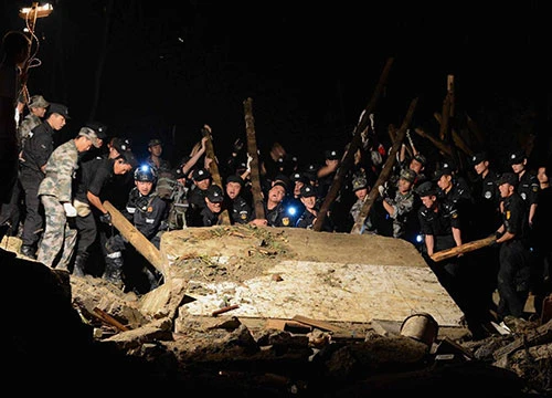 Lực lượng cứu hộ làm việc cật lực để cứu những người đang bị chôn vùi dưới đống đổ nát. Một vụ lở đất đã giết chết bảy người và bị thương 22 ở phía tây nam tỉnh Quý Châu của Trung Quốc hôm thứ Năm 28-8. Hai mươi người vẫn còn mất tích. (Ảnh: EPA)