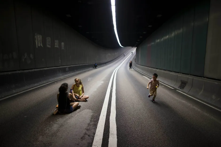 Một đứa trẻ chạy chơi trong một đường hầm tại Hong Kong mà không sợ gì xe cộ. Những người biểu tình đã chặn kín các tuyến giao thông khu trung tâm Hong Kong. Lực lượng này đang tái tập hợp lực sau khi chính phủ hủy bỏ các cuộc đàm phán với người biểu tính. (Ảnh: Reuters)